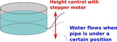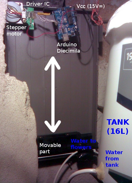 It consists of a paint can and the scanner base, latter has an Arduino and the motor driver circuit attached to it by screws. When the Arduino receives an I²C packet, it lets the water flow for the specified number of seconds. The details can be seen on the following photo.Water distributor