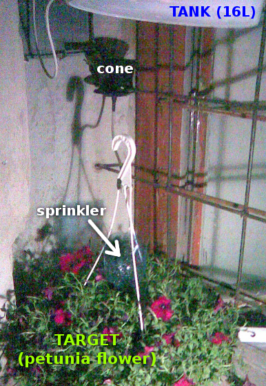 The system uses a sprinkler (created from a plastic bottle using soldering iron) to distribute the water evenly over the flower.The sprinkler is connected to a cone, which collects the water from the flow controller. The whole distributor can be seen on the following photo.