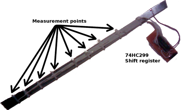 A metal rod is submerged in the water tank with eight contact pads attached to it. The metal rod is connected to the 5 volts power supply of a 74HC299 shift register, which has the pads connected to its parallel load inputs. Any controller connected to this circuit can parallel load the sensor data into the shift register and then right shift the data out using only three pins (mode, clock, data).