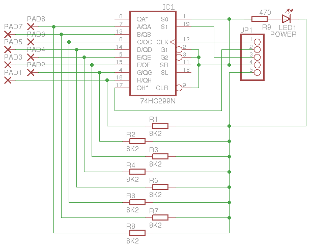 A metal rod is submerged in the water tank with eight contact pads attached to it. The metal rod is connected to the 5 volts power supply of a 74HC299 shift register, which has the pads connected to its parallel load inputs. Any controller connected to this circuit can parallel load the sensor data into the shift register and then right shift the data out using only three pins (mode, clock, data).